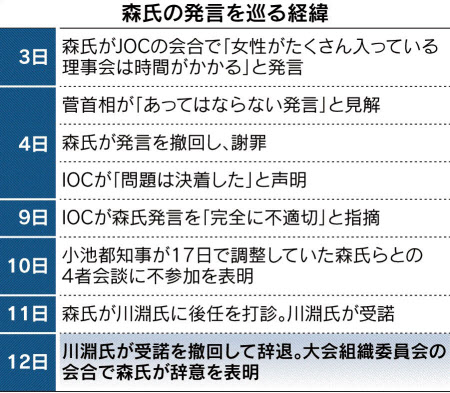 森氏は川淵氏を後継とし、会長職を託そうとした。辞任表明に先立つ10日、両氏と親しい関係者を通じ、川淵氏に電話で伝えたが、最初の答えは「NO」だった。「私は(選手村)村長くらいでいい。もっと若いのはいないのか」。この後、森氏に頼まれる形で関係者は何度も電話をかけ、「家族も大反対している」と固辞する川淵氏と押し問答が続いたが、11日朝になって「外堀は埋まってるみたいだな」と受諾の意思を示した。
