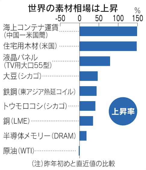 こうした消費の持ち直しによって、家電や自動車に広く使う鋼材の熱延コイルは東アジアの取引価格が1トン720ドル前後と20年春の底値より7割高くなっている。米国では約12年半ぶりの高値圏にある。テレビの汎用部材の液晶パネルも品薄が定着しており、国際価格は20年初めに比べ8割ほど高い。
