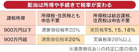 気をつけたいのが「配当への実質的な税率は所得で変化する」(ランドマーク税理士法人の清田幸弘代表税理士)こと。配当を含む課税所得が900万円以下の人の場合は、所得税は確定申告で総合課税を選択し、住民税は申告不要の手続きをするのがよい。所得税と住民税の合計の税率が源泉徴収の20%を下回り、節税になる。なお、課税所得が900万円を超えるような比較的所得が多い人は「所得税、住民税とも申告をしないまま(申告不要)が得策」(藤曲武美税理士)といえる。