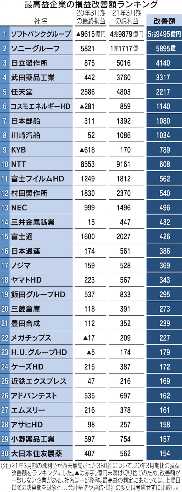 14日までに21年3月期本決算を発表した企業で、金融や変則決算などを除き過去5期以上比較できる1979社を集計した。純利益が最高だった380社について、前の期比の損益改善額が大きい順にランキングした。航空大手2社と鉄道主要21社で計2兆円超の赤字を出し、業種で明暗が分かれる状況で、電機や陸運などが底力をみせた。