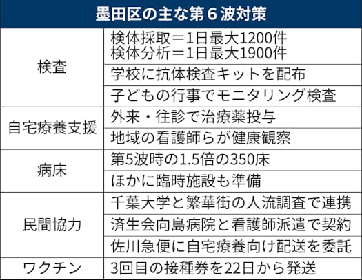 新型コロナウイルスの第6波対策は何を重視すべきか。先進自治体の一つ、東京都墨田区の方針は明確だ。ワクチンが普及し、治療薬を使える今こそ、感染者の早期発見、早期治療に力を注ぐ。それによってワクチンを受けていない子どもたちや効果が薄れる高齢者を守るというものだ。