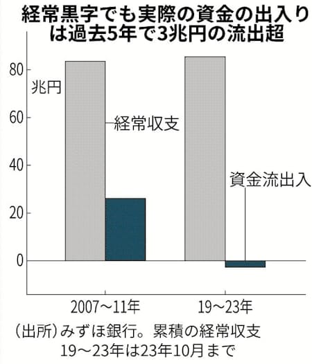 19年~23年10月の約5年間の統計上の経常収支の累積額は85兆円の黒字だったのに対し、外貨と日本円の取引ベースでは3兆円の赤字だった。海外で稼いだ外貨が実際には日本円に還流していないことを示す。