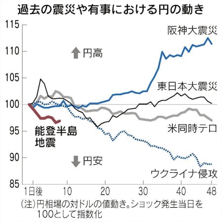 11日の外国為替市場で円相場は1ドル=145円台後半と約1カ月ぶりの円安・ドル高水準で推移した。1日に能登半島地震が発生した直後には「有事の円買い」も指摘されたが、円安基調が続いている。