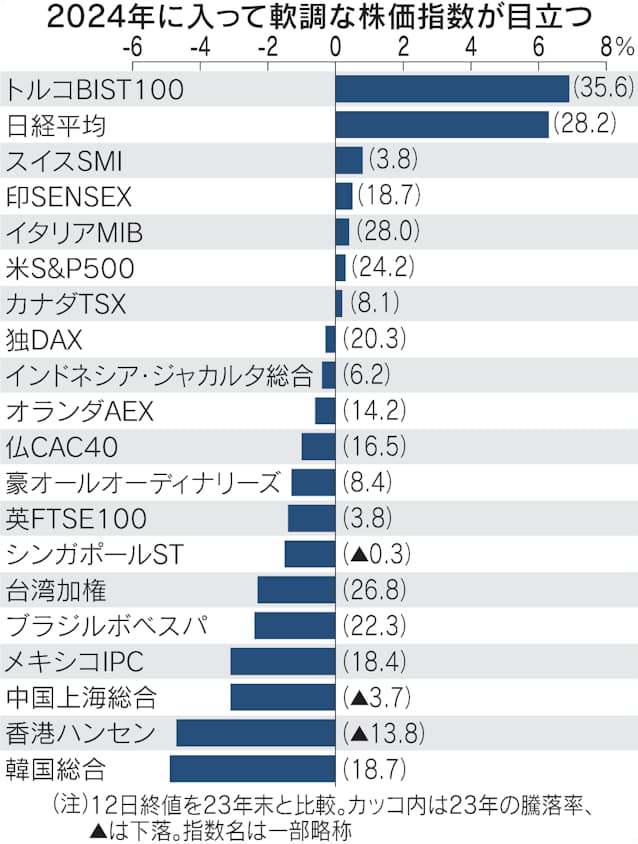 2024年初めの世界株市場は上昇の踊り場となった。日本株が急騰した裏で、主要株指数の7割は2023年末比で下落した。米連邦準備理事会(FRB)の早期利下げ予想やテック株強気論が一部修正を迫られたためだ。今週から本格化するグローバル企業の決算が株高の持続力を左右する。