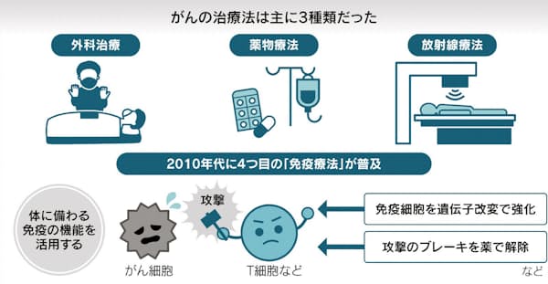 免疫療法の登場までがんの治療法は主に3種類だった。手術でがんを取り去る外科治療、抗がん剤などで攻撃する薬物療法、放射線で壊す放射線療法だ。10年代、画期的な効果をもつがん免疫薬「オプジーボ」などが登場し4つ目の治療法として確立した。
