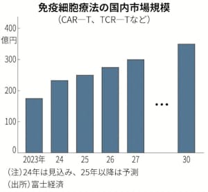 富士経済によるとCAR-T、TCR-Tなどの細胞治療製品の国内市場規模は30年に23年比2倍の350億円に達する見通しだ。